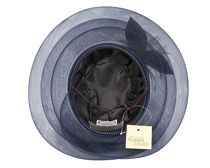 Beautiful navy fashion hat by Cupids Millinery Melbourne. Fabric covered dome crown with multi-layered crinoline brim and hand-made flower with feather adornment. Each hat is individually made to order and we can make it in any color on request